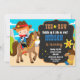 Invitation à l'anniversaire de Cowboy Invitation de Cowboy pour invitation à l'anniversaire de Western garçon. Invitation tes amis avec cette invitation occidentale brillante et colorée ! Cette invitation à thème champêtre Brown et bleu présente un garçon à cheval, un badge shérif et une bottes de cowboy. Modifiez simplement ce modèle facile à utiliser dans le menu Personnaliser pour le rendre spécial.