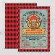 Parfait pour le mec viril ! Invitation de fête de bûcheron avec un grand bûcheron barbu, des haches, du bois coupé sur un fond de flanelle. Parfait pour un anniversaire, une retraite, un enterrement de vie de garçon, un événement important ou n'importe quelle fête virile. Illustration dessinée à la main par McBooboo. Veuillez me contacter à tkatz@me.com pour tout problème