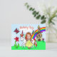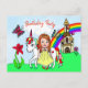 Un joli dessin animé de style folk art représentant une princesse et une licorne dessinées à la main en rouge avec un château, des fleurs et un papillon en arrière-plan. Un moyen joli mais abordable de distribuer de nombreuses invitations d'anniversaire sur le thème des contes de fées.
