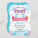 Invitation d'anniversaire jumelle de Sirène en rose turquoise, violet et corail avec une paire de mignonnes filles jumelles assis sur des bulles. Le texte dit : "Faisons tous un éclat dans un bain d'anniversaire jumeau !" Parfait pour une fête d'anniversaire à thème jumelle ou une fête de natation.