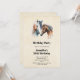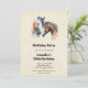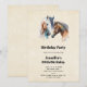 Une invitation à une fête d'anniversaire avec un beau dessin à l'aquarelle. Avec une paire de chevaux, marron et blanc. Tête et cou visibles avec de la peinture qui goutte à la base de leur cou. Ambiance sud-ouest.