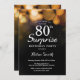 Carte d'invitation d'anniversaire de surprise de parties scintillantes d'or quatre-vingtième. Anniversaire adulte. Arrière - plan de Bokeh de parties scintillantes d'or. 13ème 15ème 16ème 18ème 10ème 21ème 30ème quarantième cinquantième soixantième soixante-dixième quatre-vingtième quatre-vingt-dixième 100th. Tout âge. Pour davantage de personnalisation, cliquez sur svp la "personnaliser il" bouton et utilisez notre outil de conception pour modifier ce modèle.
