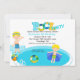 Commencez votre fête avec cette adorable invitation. Parfait pour la fête de piscine de ce garçon d'anniversaire. Il a un arrière - plan blanc. Une grande piscine avec un adorable et mignon garçon se tient à côté dans une flaque d'eau. Il a les cheveux blonds et les lunettes bleues sur la tête. Dans la piscine se trouve un mignon garçon blond aux cheveux flottant dans un radeau. De l'autre côté du invitation se trouve le mot pool party. Les deux O dans la piscine sont des tubes colorés. Découvrez les nombreux autres produits et designs de cette ligne de fête de piscine. ©Illustrations JW