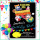 Noir, garçon "Calling All Super Hero's", invitation d'anniversaire animal qui présente de mignons renards super héros, vache et chaton animaux dans l'espace. Texte de l'âge modifiable.