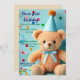 Cette carte d’invitation présente un design gai et ludique, idéal pour une fête d’anniversaire d’enfant ou une fête festive. Il présente un mignon ours en peluche à la fourrure marron clair, portant un casquette bleu avec un pom-pom en haut et un arc bleu assorti autour du cou, également un arrière - plan bleu clair orné de points de confettis colorés et de rubans, ajoutant une ambiance vibrante et festive. Les tons clairs et pastel, bleu, rose, jaune, orange et vert, créent une ambiance animée et accueillante.