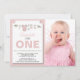 Une belle et moderne invitation photo pour le premier anniversaire que vous pouvez personnaliser et envoyer à vos amis et à votre famille pour célébrer l'anniversaire. Le texte est défini dans une typographie populaire. Remplacez la photo d'exemple par la vôtre. Les couleurs de texte rose, vert et noir peuvent être modifiées à l'aide du menu d'édition. Le motif à rayures blanches et roses orne le dos de la carte. D'autres couleurs et motifs sont disponibles.