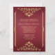 Cette invitation de célébration d'anniversaire de mariage formel présente des images d'art de l'ère victorienne en or en haut et en bas, et une bordure dorée victorienne assortie sur les côtés. Le texte personnalisable est également en or, et le tout est placé sur un fond rouge élégant brûlé.