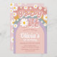 L'invitation à l'anniversaire, sur le thème rétro, présente des tons pastels de Rainbow et des fleurs Daisy dans l'arrière - plan. C'est parfait pour une fête d'anniversaire de 1ère les années 70 rétro.