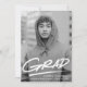 Invitations modernes et branchés de la fête de remise des diplômes avec la photo verticale senior du diplômé avec "Grad" en lettres blanches avec un trait de soulignement ci-dessous. Personnalisez le devant des invitations à la fête de remise de diplômes en ajoutant le nom du diplômé, le nom de l'école et l'année de remise de diplômes. L'invitation inverse pour afficher les détails de votre fête de remise de diplômes avec un arrière - plan de coups de pinceau noir et blanc.