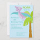Commencez votre fête avec cet adorable invitation anniversaire de enfant. Il est situé sur un arrière - plan bleu ciel clair avec un palmier sur un côté avec un pterodactyle violet volant au-dessus. Consultez nos autres dessins et couleurs dans cette ligne.© Illustrations JW