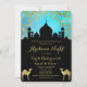Invitation de fête sur le thème Nuit Arabesque en sarcelle et or. Parfait pour un anniversaire de tout âge, un sweet sixteen ou une Quinceanera