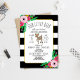 Une invitation baby shower illustrant l'illustration d'un cerf de bébé portant une couronne de fleurs roses. Personnalisez le texte. L'Arrière - plan est un motif rayé noir et blanc.
