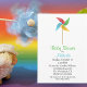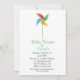 Invitation baby shower blanc, avec un volant coloré de style jouet, en haut. Personnalisez tous les champs de texte de votre événement baby shower.