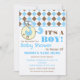 Une invitation baby shower avec une bordure supérieure de Jacquard bleu et marron avec garniture bleue. Pince à couches bleues attachée à la bordure supérieure et en forme de cercle avec le transport de bébé bleu à l'intérieur. Personnalisez le texte bleu et marron avec les détails de votre occasion.