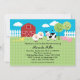 Invitation mignonne et colorée de baby shower avec un thème de ferme. Comporte des animaux de ferme aimables, une grange rouge, des arbres et une barrière sélectionnée sur un arrière - plan vert clair et de pois de bleu. Cette conception unisexe donnera le ton pour une douche mémorable. Ajoutez vos propres mots.