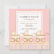 Trois fois la joie ! C'est le faire-part à cette invitation de baby shower qui comporte trois voitures d'enfant adorables avec les rayures roses, bleues, jaunes, et brunes sur un arrière - plan rose.