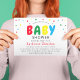 Invitations amis et famille le long pour une fête baby shower avec cette invitation unisex colorée moderne. Avec un arrière - plan blanc classique, la typographie arc-en-ciel, de mignons petits confettis à pois de polka et un modèle qui peut facilement être customisé.