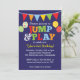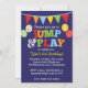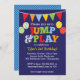 Notre invitation colorée Jump & Play Balloons en bleu marine et couleurs primaires brillantes comporte des lettres colorées, des motifs et des ballons et constitue une invitation parfaite pour toute fête d'enfant avec un thème de bounce house, trampoline ou saut et jeu.