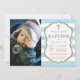 Invitation de baptême de parties scintillantes de bleu et d'or avec la photo faite sur commande. Baptême de garçon. Première communion. Baptême. Dévouement d'enfant. Rayures bleues et blanches. Pour davantage de personnalisation, cliquez sur svp la "personnaliser il" bouton et utilisez notre outil de conception pour modifier ce modèle.