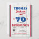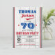 N'importe quel âge - vous pouvez modifier le numéro comme vous le souhaitez. Vous pouvez déplacer et redimensionner la queue de texte pour l'adapter à votre nom. Arrière - plan en bois rustique pour une invitation chic et classe pour adultes ou enfants. Le thème des couleurs rouge et bleu.