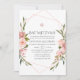Aquarelle rose vif invitation bat mitzvah avec des accents de sauge vert ornant un cadre géométrique doré.
