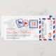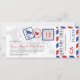 Une carte d'embarquement a inspiré l'invitation de billet avec des détails de timbre de passeport d'amusement et des rayures de par avion. Montré dans les nuances du bleu lumineux, gris-foncé rouge et royal et gris-clair. L'arrière inclut l'espace supplémentaire pour n'importe quelle information d'hôtel, de voyage ou de site Web.