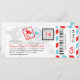 Une carte d'embarquement a inspiré l'invitation de billet avec des détails de timbre de passeport d'amusement et des rayures de par avion. Montré dans les nuances de l'Aqua, rouge lumineux, noir, gris-foncé et gris-clair. L'arrière inclut l'espace supplémentaire pour n'importe quelle information d'hôtel, de voyage ou de site Web.