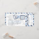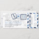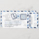 Une carte d'embarquement a inspiré l'invitation au billet avec des détails amusants de timbres de passeport et des bandes d'avion. Montré dans les tons Navy, Bleu Poudre, gris foncé et gris clair. Le verso comprend un espace supplémentaire pour tout hôtel, voyage ou information sur le site Web.