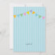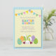 Une invitation au brunch de Pâques, dans de belles couleurs en pastel, comportant un lapin sortant du sien terrier avec des oeufs de pâques et des drapeaux colorés sur un fond rayé bleu.