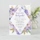Des fleurs violettes et bleues élégantes créent un cadre en forme de diamant pour entourer les détails de votre brunch d'après-mariage.