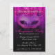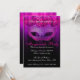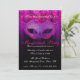 Invitation de célébration de fête masquée Rose & Violet. Une invitation élégante et sophistiquée présentant un masque de mascarade de teintes violettes et roses avec des fioritures noires, un fond de teintes violettes/roses avec un motif damassé subtil sur fond noir et un texte élégant qui peut être personnalisé pour les détails de votre fête.