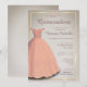Cette invitation de célébration/fête de quinceañera présente une belle robe rose clair sur fond beige avec un cadre doré (non métallisé).