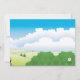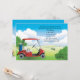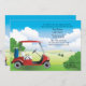 Un chariot de golf rouge se reposant sur le vert avec la silhouette de deux golfeurs tout près. Une invitation terrible à la retraite d'un enthousiaste de golf ou à la fête d'anniversaire ou pour une invitation de fond-éleveur de sortie de golf.