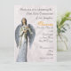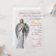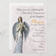 Un bel ange argenté tenant une croix contre lui est coffre est la seule décoration pour cette première invitation de communion de houx. L'arrière - plan est dans des tons roses et gais très légers. Je choisis un papier de toile pour un regard plus élégant. Il est totalement personnalisable.