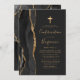 Le bord gauche de cette élégante invitation de confirmation moderne comporte une bordure en aquarelle noire ornée d'une parties scintillant en faux or. Une fausse croix de feuille d'or apparaît au-dessus du texte personnalisable, qui combine écriture manuscrite de couleur or, cuivre et polices italiques sur un arrière - plan noir d'ardoise. L'envers est assorti d'un design d'agate noir et or.