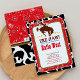 Salut ! Célébrez votre Baby shower avec notre Invitation à la fête de Cowboy. Cette invitation de fête occidentale présente un cowboy rodéo sur son cheval, motif de vache et motif paisley rouge. Une invitation à la fête de rodéo parfaite pour votre fête de baby shower sauvage à l'ouest, des invitations à la douche de bébé à couple occidental ou les utiliser comme invitation de rodéo cowboy