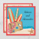 Vous êtes-vous mariés en privé et souhaitez maintenant célébrer votre mariage avec vos amis et votre famille. Alors cela pourrait convenir. Bagages avec autocollants de voyage, lei et planches de surf sur une plage de sable et le dos pour les informations de votre fête avec des étoiles de mer dispersées. Lumineux et coloré pour cette réception de mariage après-mariage ou de destination de plage amusante. Illustration dessinée à la main par McBooboo.