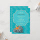 Une invitation marine de dîner de répétition avec un talent tropical. L'arrière - plan abstrait bleu-vert est recouvert avec un flourish bleu qui tient votre information et est embelli avec une collection de coquillages et d'un poisson orange d'étoile. Il est facile customiser la carte avec vos mots, police, couleur de police et choix de six types de papier.