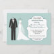 Cette invitation moderne comporte le smoking d'un marié et la robe de mariage noirs de la jeune mariée blanche sur un arrière - plan bleu vert. Vous pouvez employer cet invitation pour épouser des annonces, invitations de partie de fiançailles, sauvez la date, le dîner de répétition ou épouser des invitations de déjeuner.