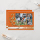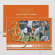 Annonce de graduation en or avec rayure universitaire et triple photo pour la promotion 2025 en orange et or.