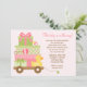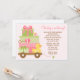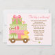 Cette invitation mignonne de baby shower comporte des cadeaux roses et verts de bébé et un caoutchouc mignon dans un chariot. Cette invitation moderne et d'amusement de baby shower est parfaite pour que n'importe quelle maman soit.