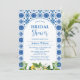 Tuile de citron bleu moderne Invitation Douche nuptiale bleu moderne carreaux méditerranéens et citrons invitation à la douche nuptiale avec un motif de carreaux bleus, arche et citron à fleurs.