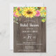 Invitation à la douche nuptiale avec des tournesols en cascade en jaune, rose et vert sur un arrière - plan en bois. L'arrière de l'invitation a le même arrière - plan en bois aquarelle.