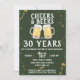 Tasses de bière peintes sur l'arrière - plan de vert forêt, "ACCLAMATIONS et BIÈRES", invitation de fête d'anniversaire. Motif de style de Pub sur les caractéristiques, les houblon, le blé, le verre de bière, la tasse de bière et les bretzels arrières. La couleur et le style de police peuvent être customisés.