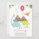 Une invitation de fête d'anniversaire pour des enfants, comportant un dinosaure et un ballon.