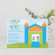 L'invitation de fête d'anniversaire de ce garçon 5x7 a un bleu, un vert, et un bouncehouse de rayures d'orange du côté droit avec votre information facilement personnalisable de partie du côté gauche. Il y a deux garçons rebondissant à l'intérieur de la maison. Studio de cacao