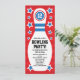 L'amusement et le bowling coloré party l'invitation pour des enfants comportant une goupille de bowling blanche avec l'âge personnalisable d'anniversaire et invitent le texte entouré par les étoiles blanches et bleues sur un arrière - plan rouge. Pour des demandes faites sur commande veuillez emploient le lien de contact de magasin ci-dessus.