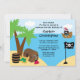 Cet invitation de fête d'anniversaire de pirate des garçons 5x7 a une navigation de bateau de pirate dans l'eau avec un coffre au trésor, le drapeau de jolly roger et une carte sur une île. Au milieu, vous pouvez facilement customiser votre information de partie à cette invitation. Conception de conception de Babystar