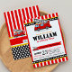 Sonne l'alarme ! Célébrez votre fête d'anniversaire de pompier avec notre Invitation de la Fête des Moteurs de Feu. Cette invitation d'anniversaire de moteur à feu rouge et noir comporte un camion feu rouge sur motif à rayures rouges. Parfait pour votre petit garçon allumer camion premier anniversaire, fête d'anniversaire de moteur d'incendie ou fête de baby shower de camion d'incendie.