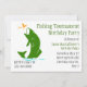 L'invitation élégante de fête d'anniversaire de pêche faite dans le blanc, avec des graphiques de silhouette d'un vert a coloré sauter bas de grande bouche, de l'eau, après un insecte orange. Le texte en vert et noir est prêt à personnaliser pour votre jour spécial. Grande idée de partie pour le pêcheur avide.